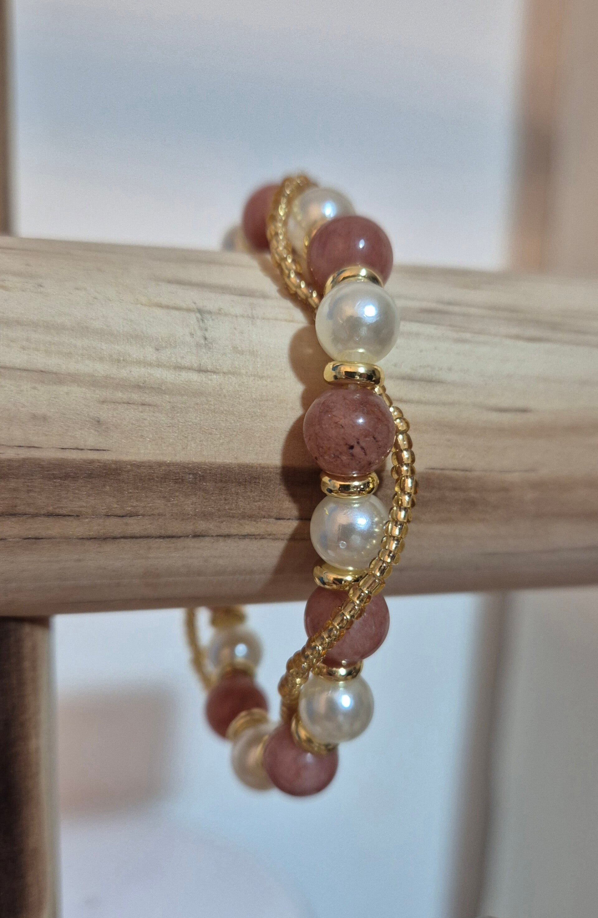 Bracelet en morganite (perles roses) avec perles dorées et nacrées.
