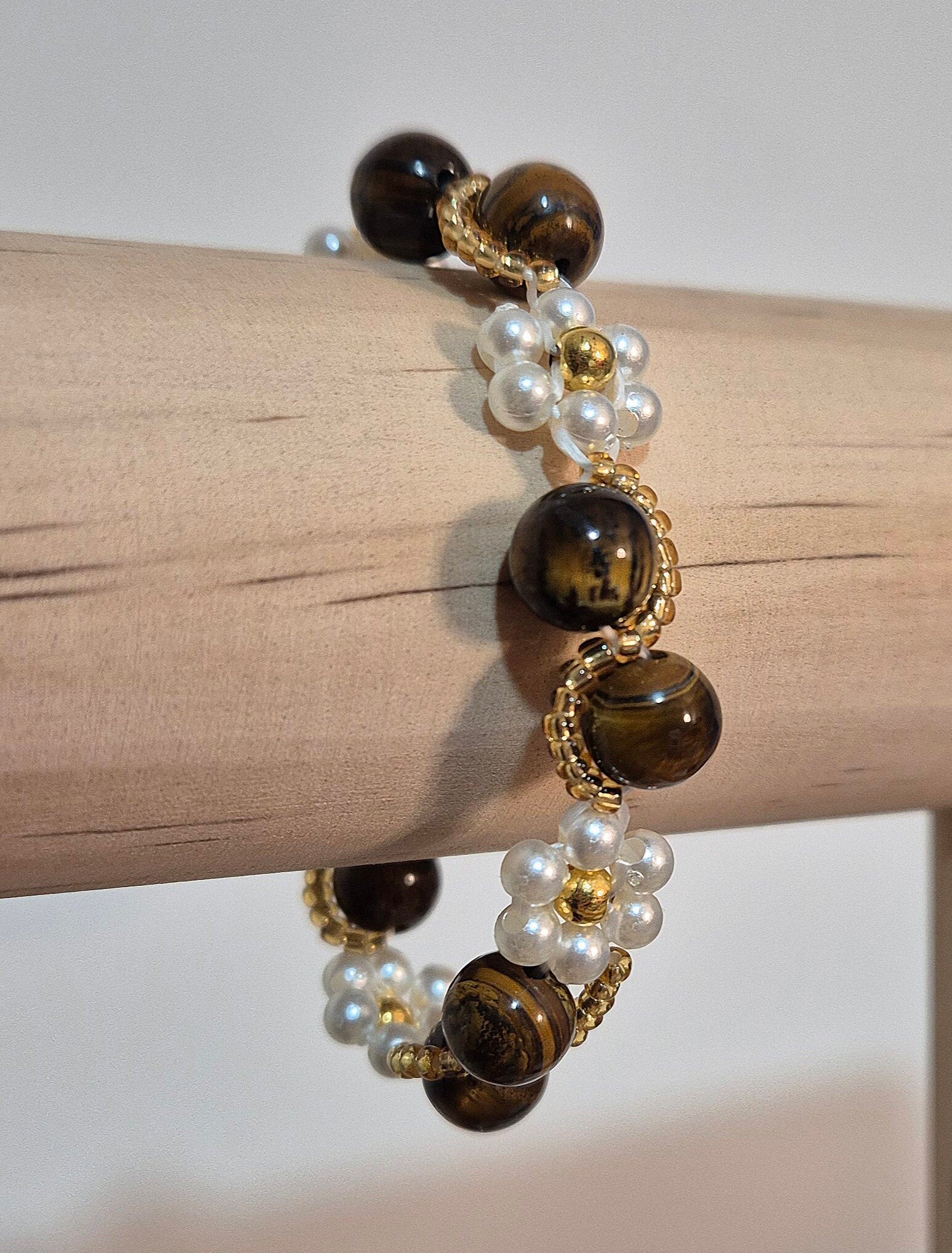 Bracelet avec pierres d'œil de tigre (pierres marrons), perles dorées et perles nacrées, forme de fleur.