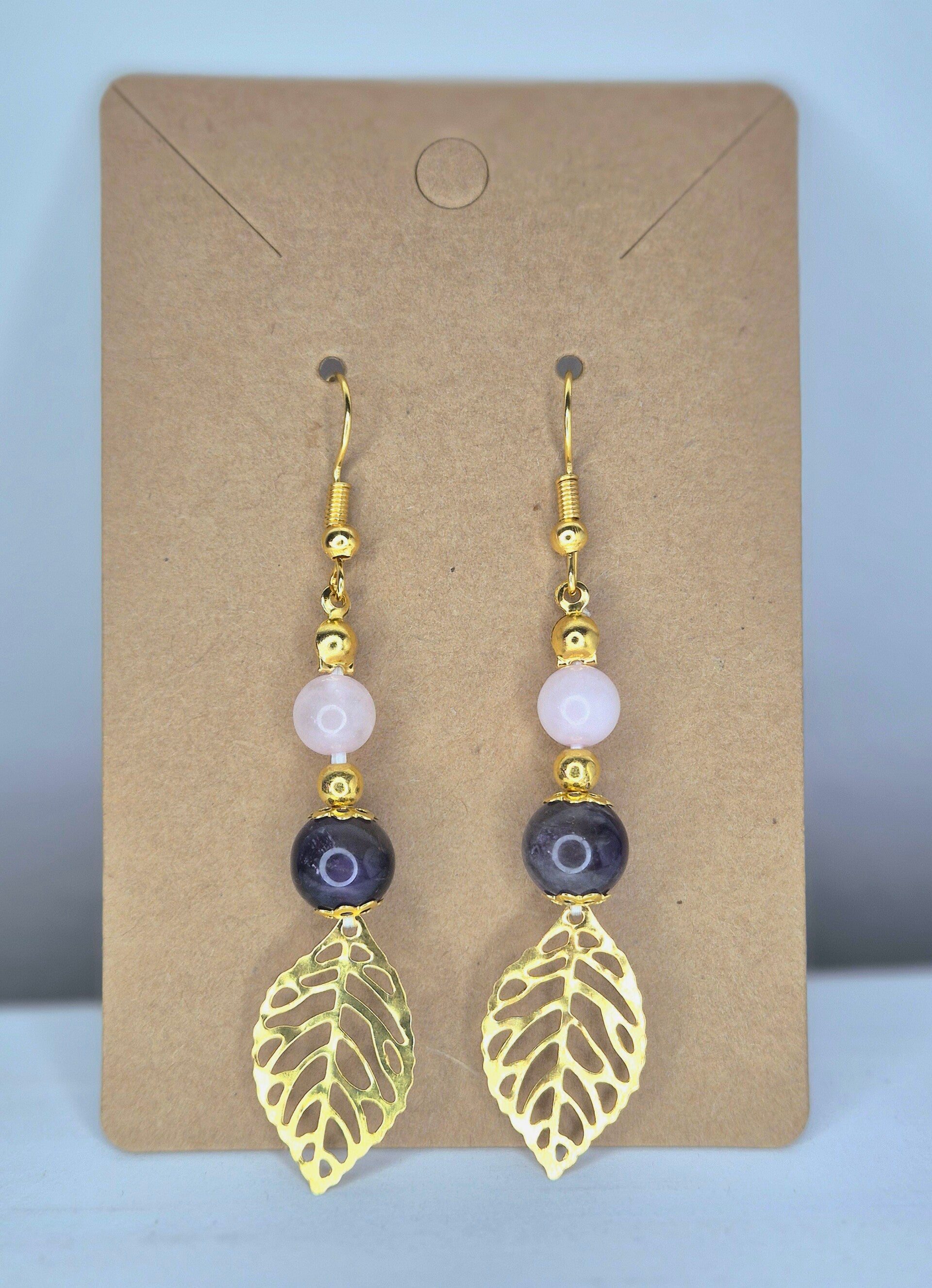 Boucles d'oreilles en argent jaune et pierres de quartz rose et amethyste avec perles dorées