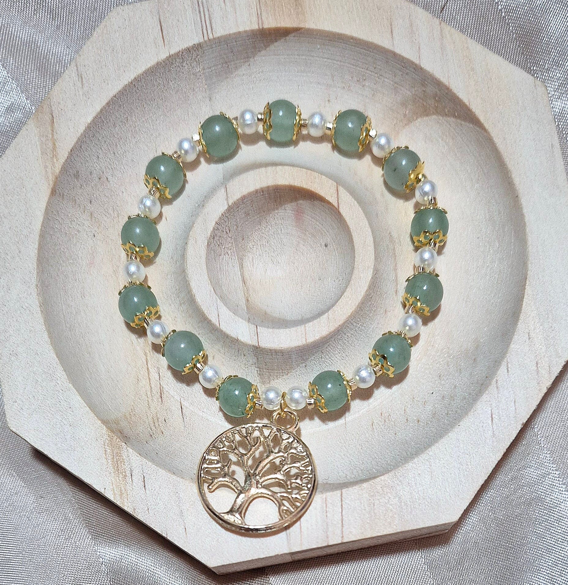 Bracelet en aventurine avec perles nacrées et dorées; avec arbre de vie
