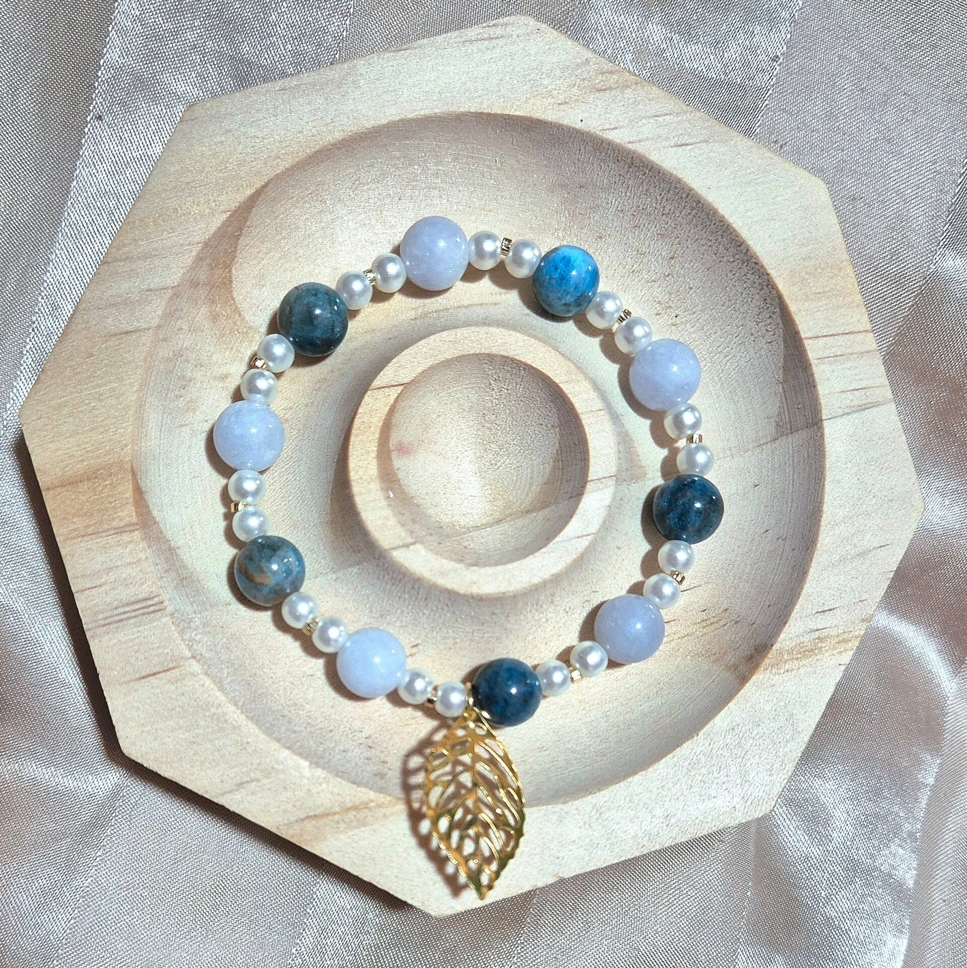 Bracelet en aigue marine et apatite avec perles dorées en plaqué or 18 carats et feuille dorée